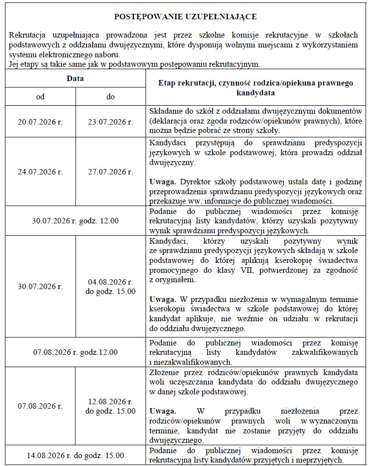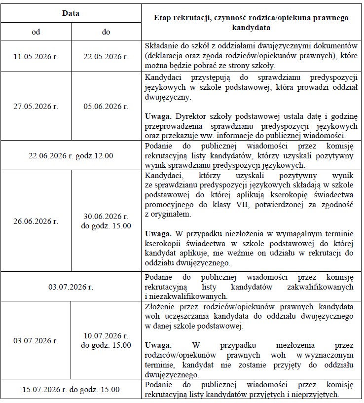 Harmonogram czynności w postępowaniu rekrutacyjnym oraz postępowaniu uzupełniającym do oddziałów dwujęzycznych na poziomie klas VII w szkołach podstawowych prowadzonych przez Miasto Łódź, na rok szkolny 2026/2027.