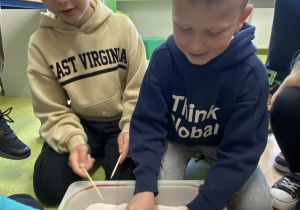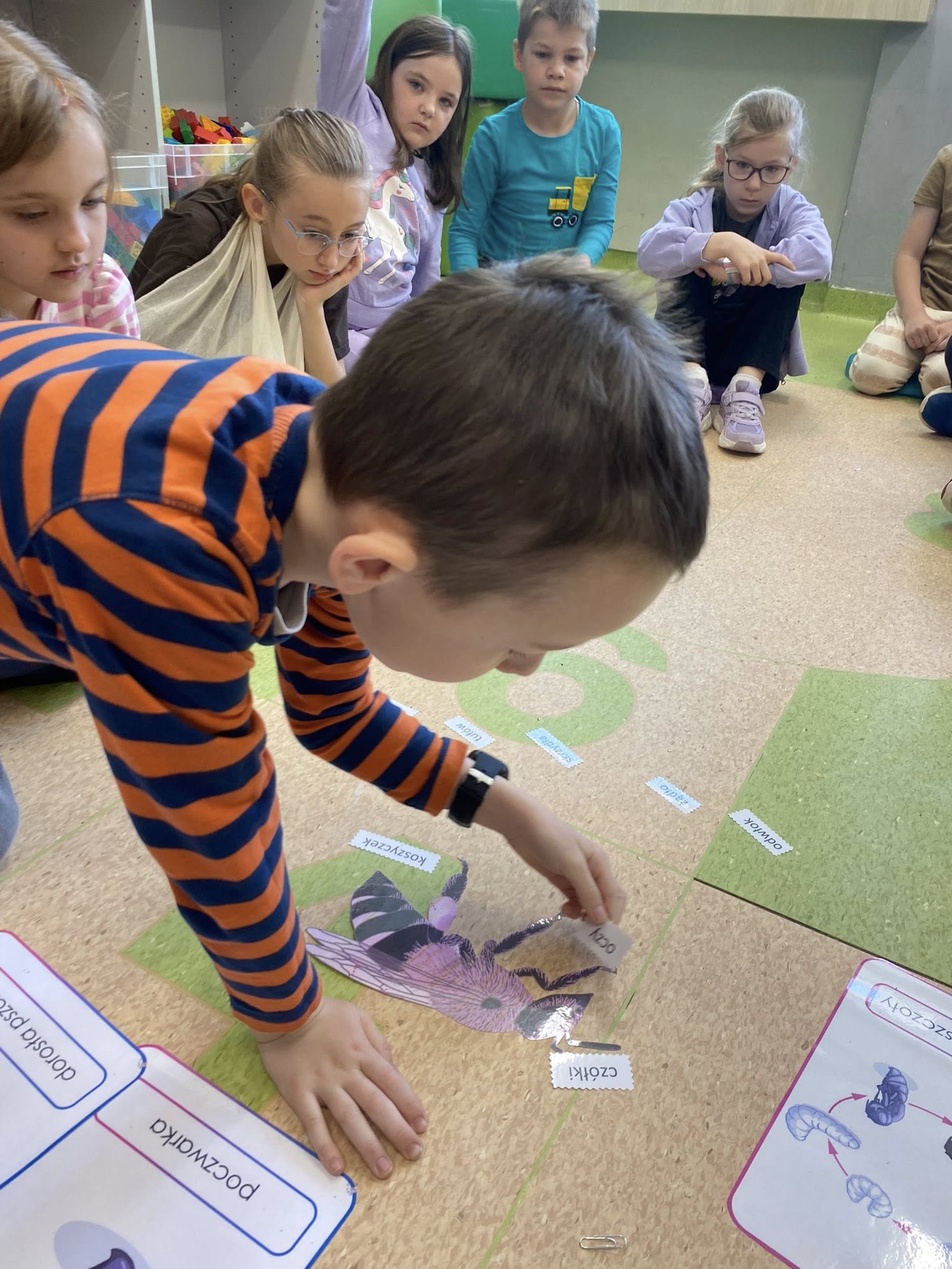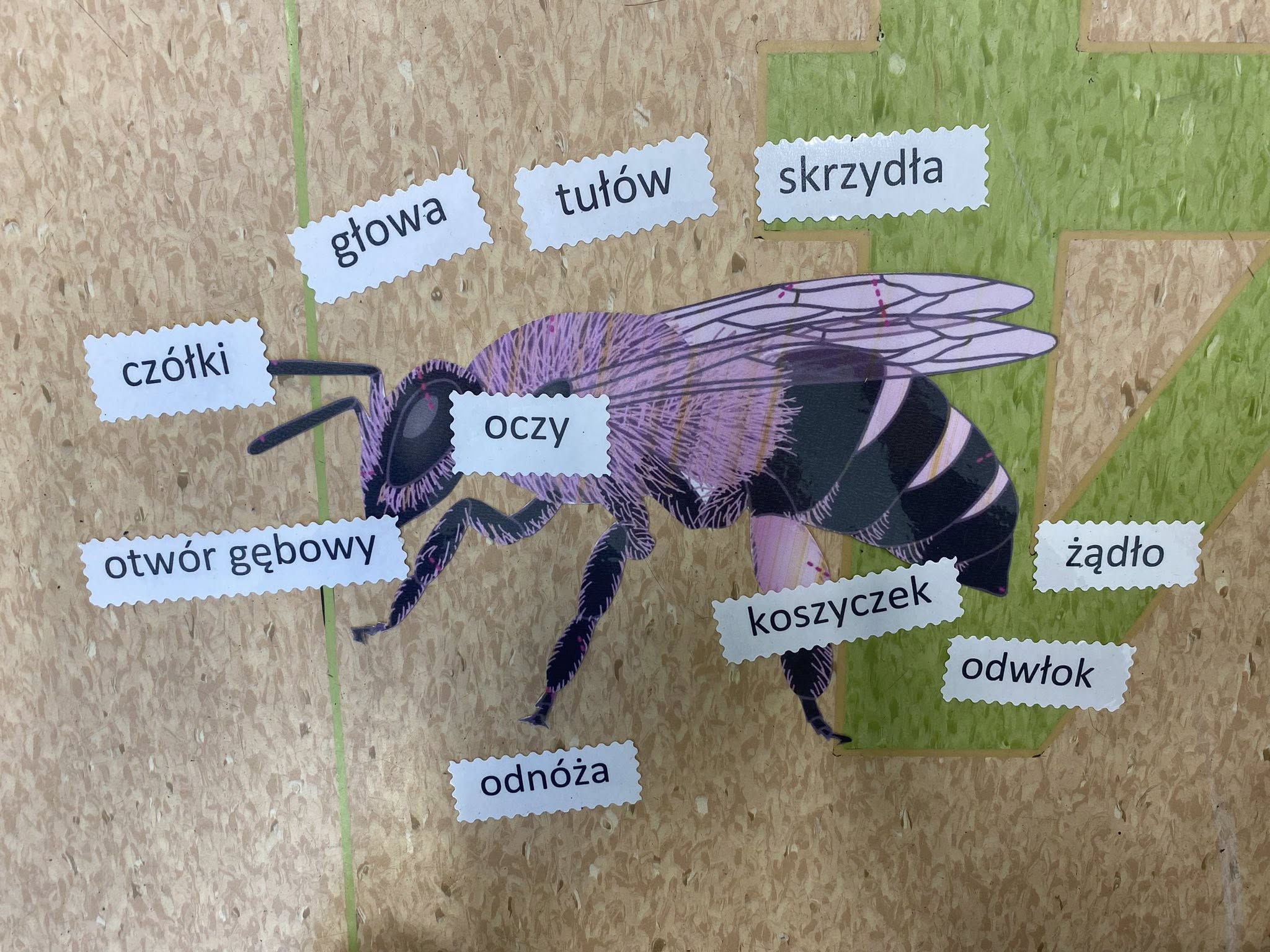 Omówiliśmy budowę pszczoły miodnej oraz cykl jej rozwoju. Wzięliśmy udział w konkurencjach zręcznościowych ćwiczących sprawność ręki między innymi wyścigi w znajdywaniu zakopanych w soli pszczół patyczkami do sushi. Wykonaliśmy również wspólnie pracę plastyczną -plaster miodu.