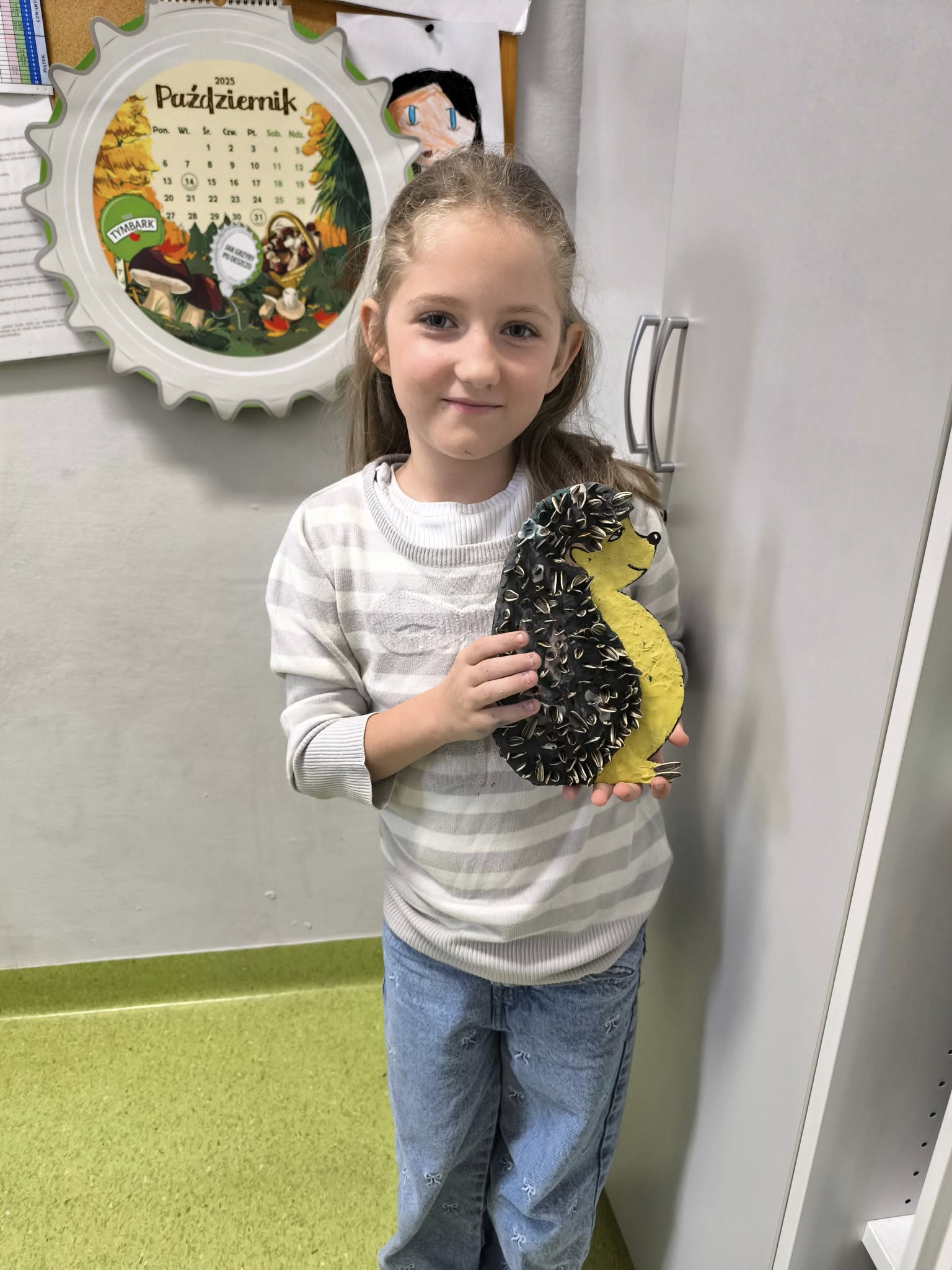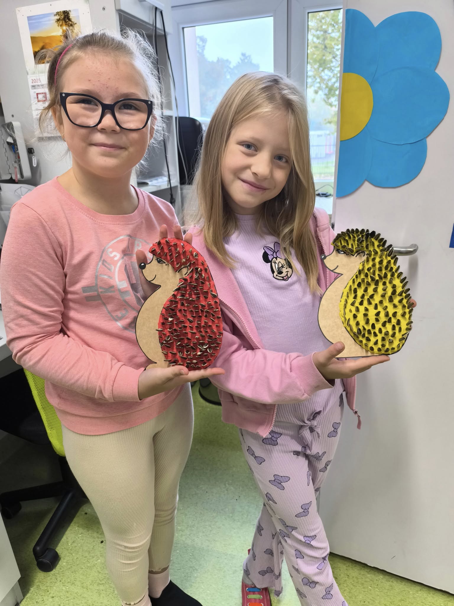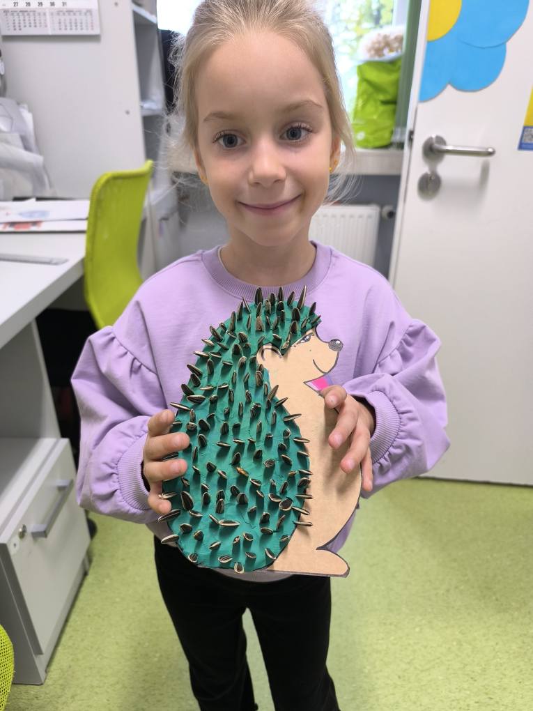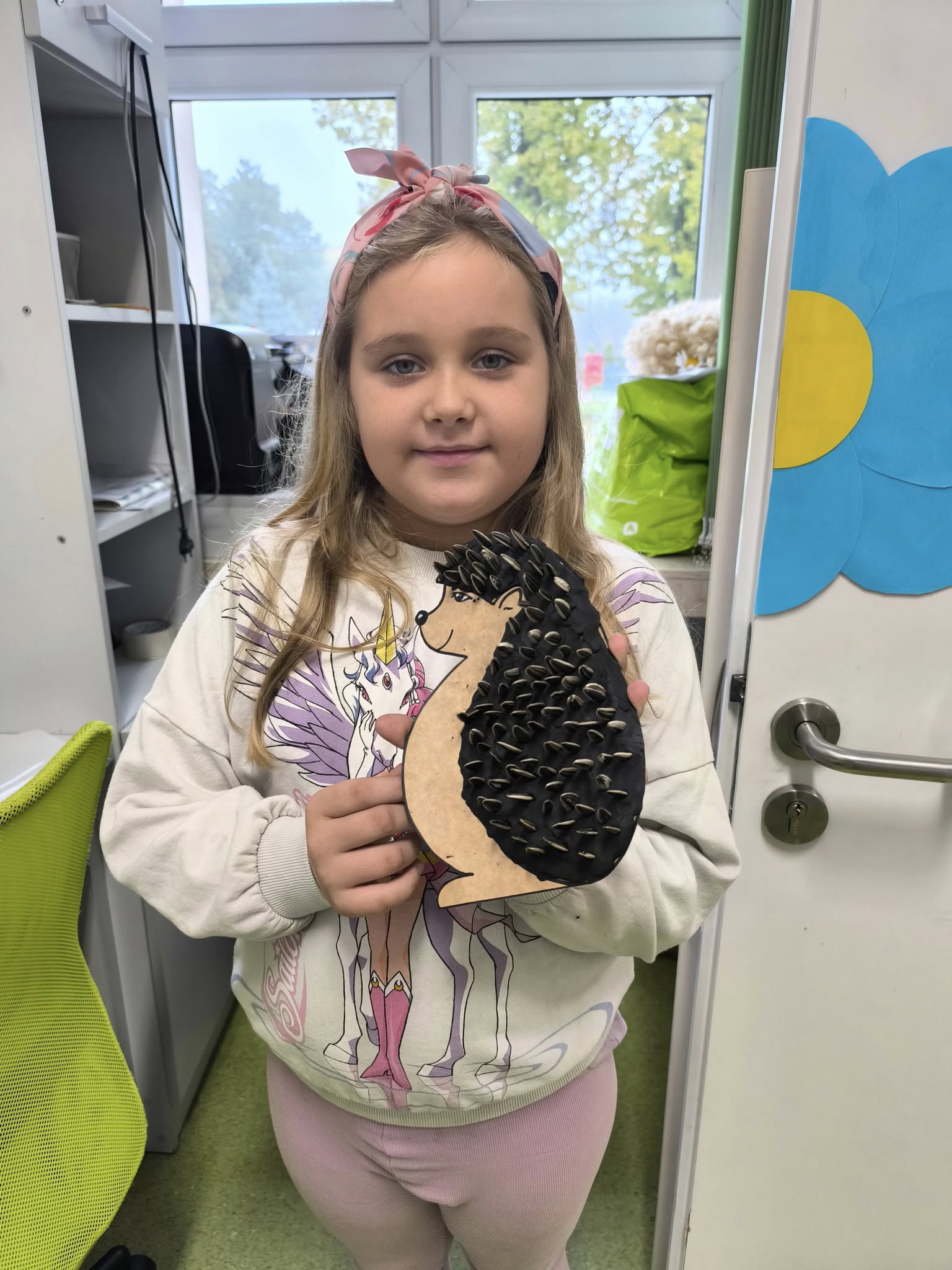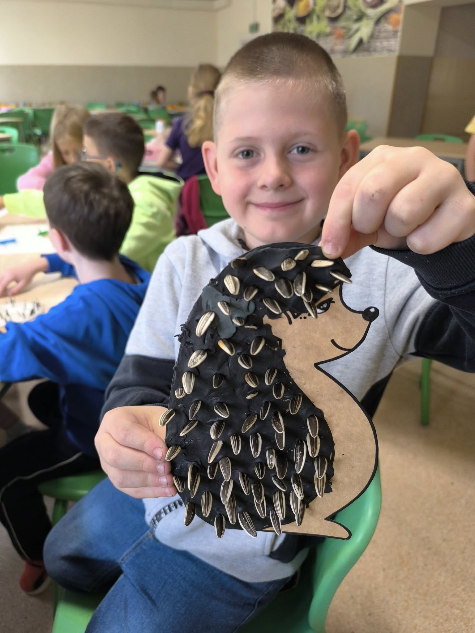 Dzieci ze świetlicy stworzyły przepiękną jesienną dekorację – urocze jeżyki wykonane z pestek słonecznika.