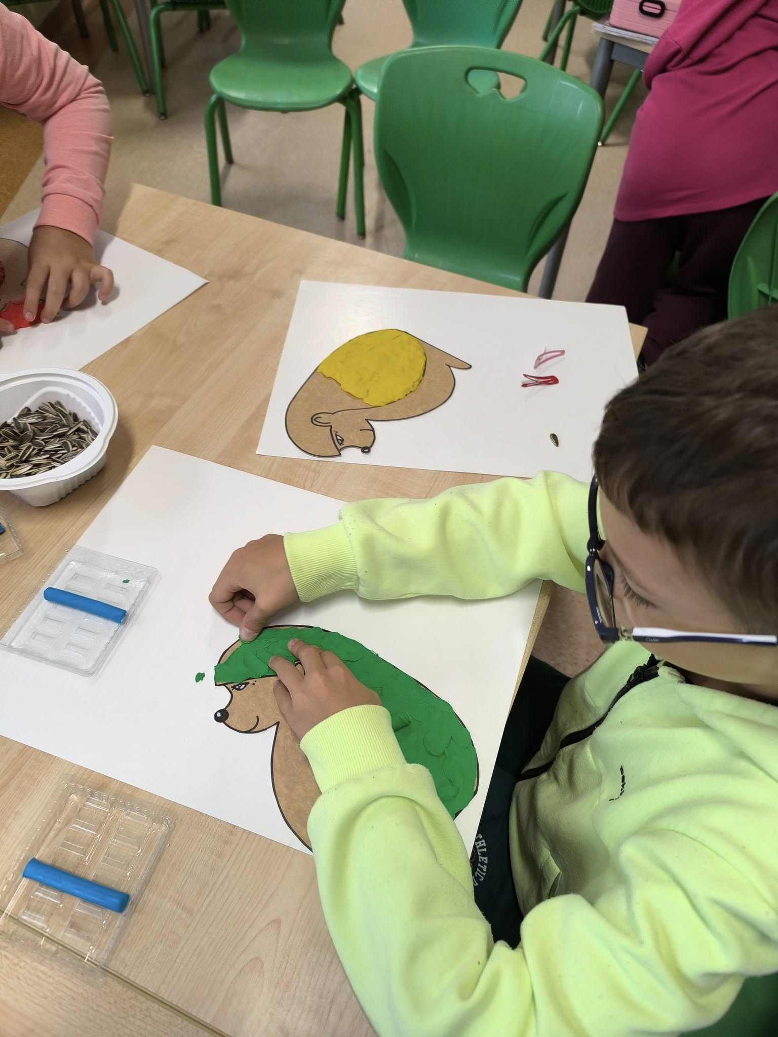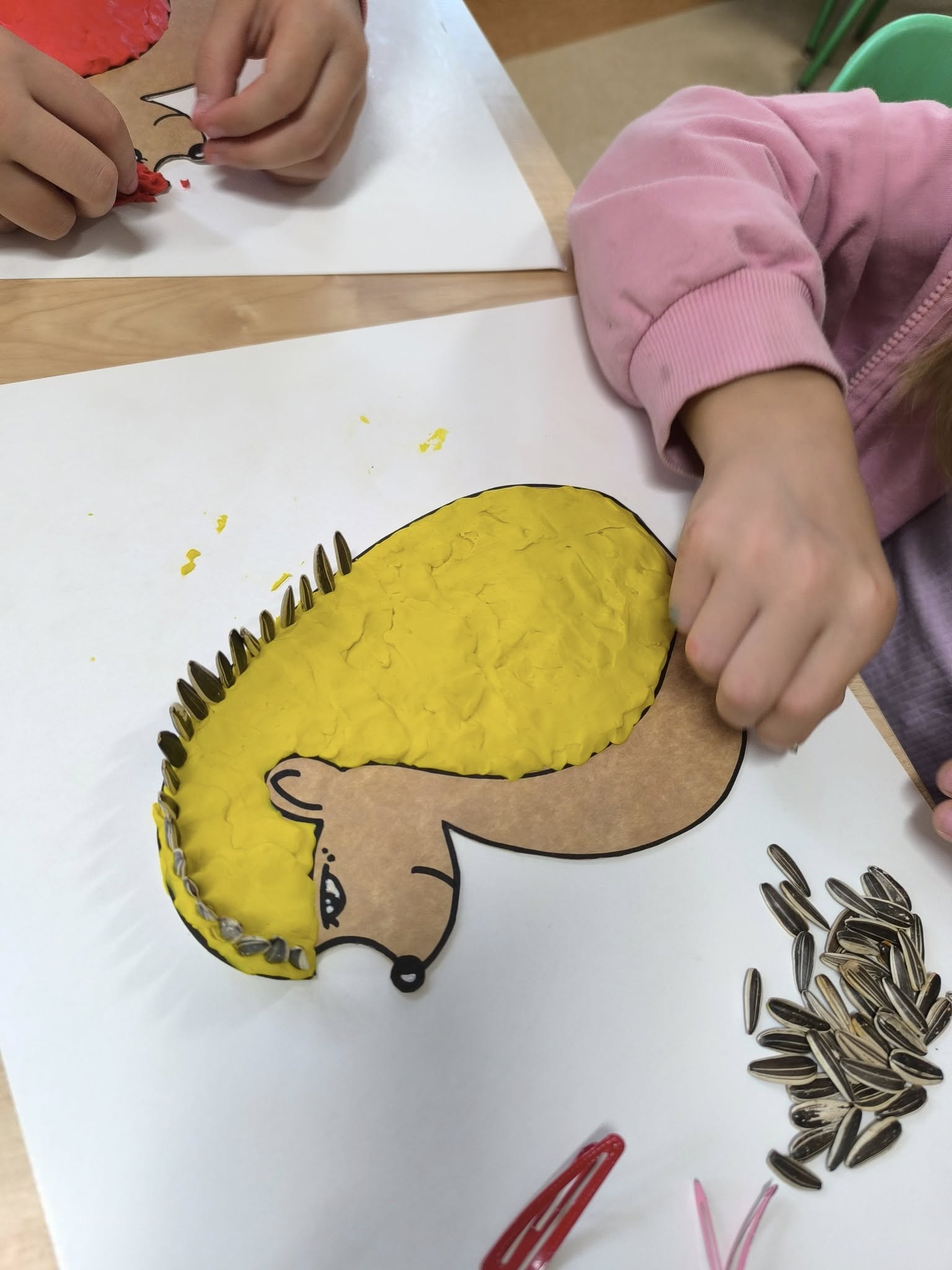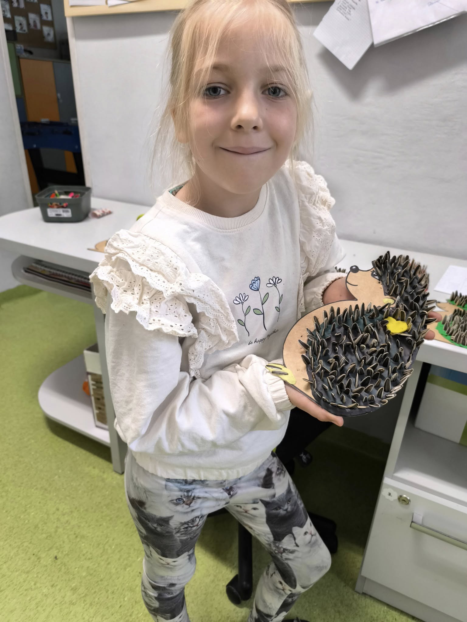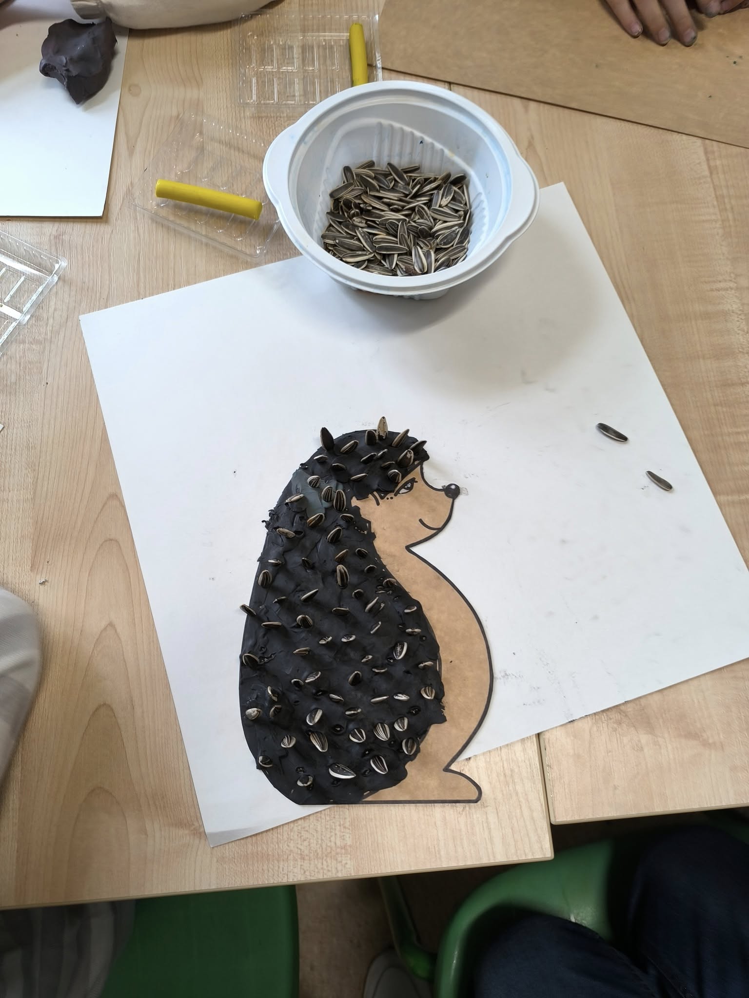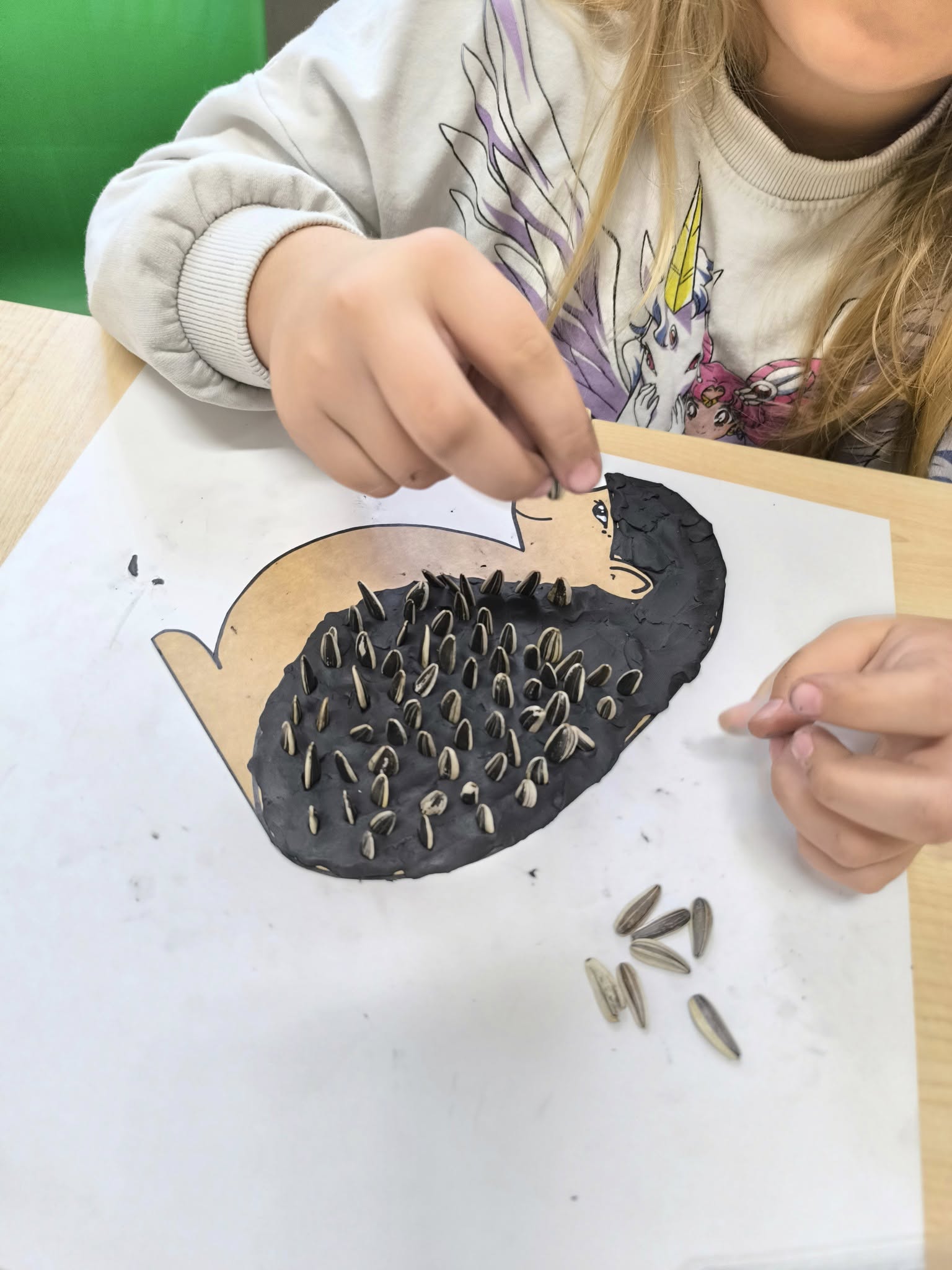 Dzieci ze świetlicy stworzyły przepiękną jesienną dekorację – urocze jeżyki wykonane z pestek słonecznika.