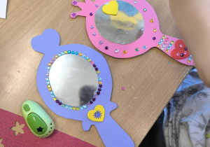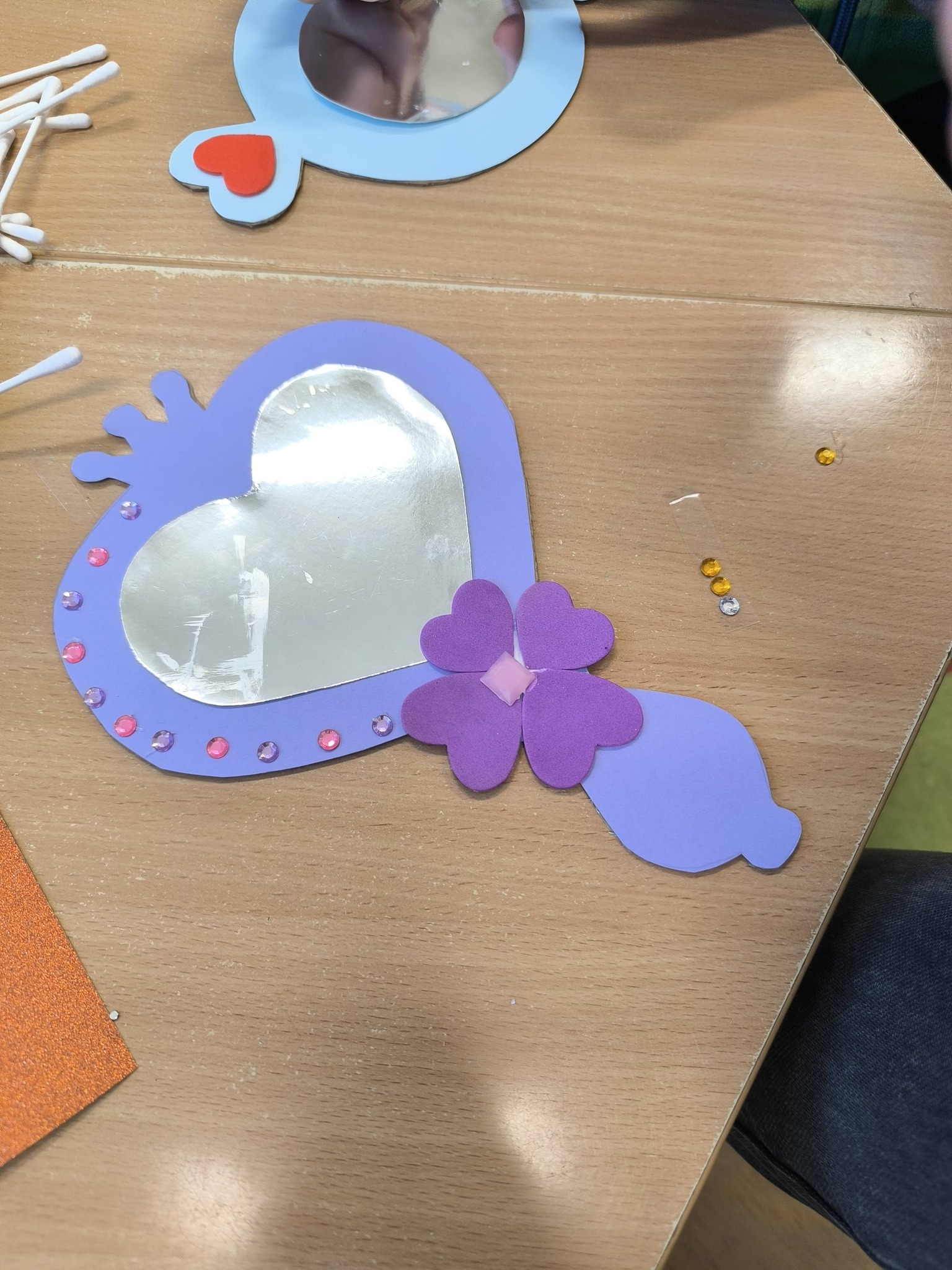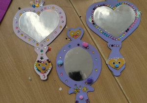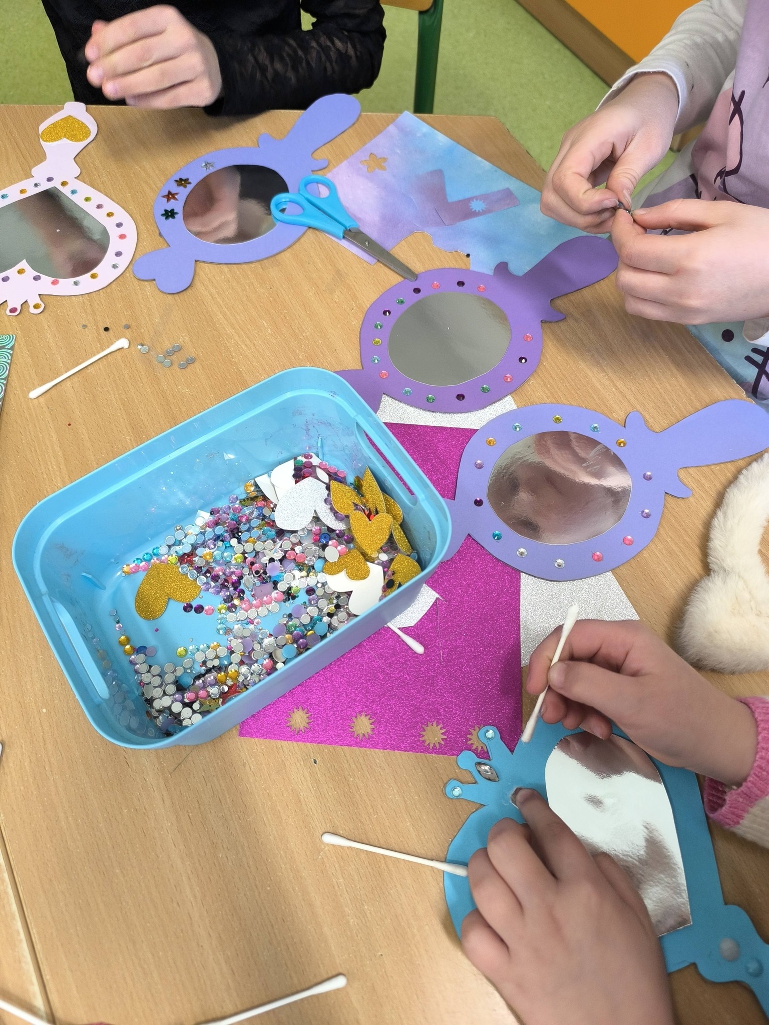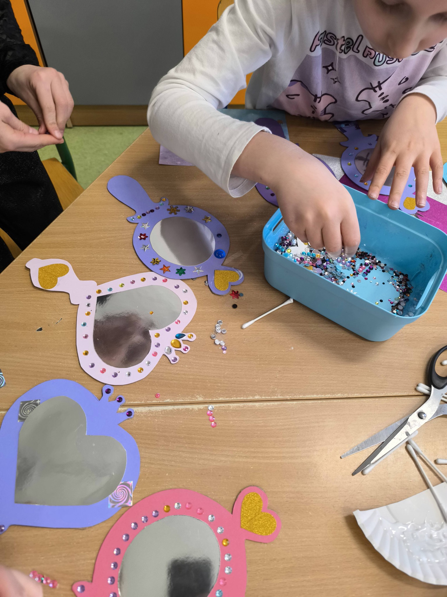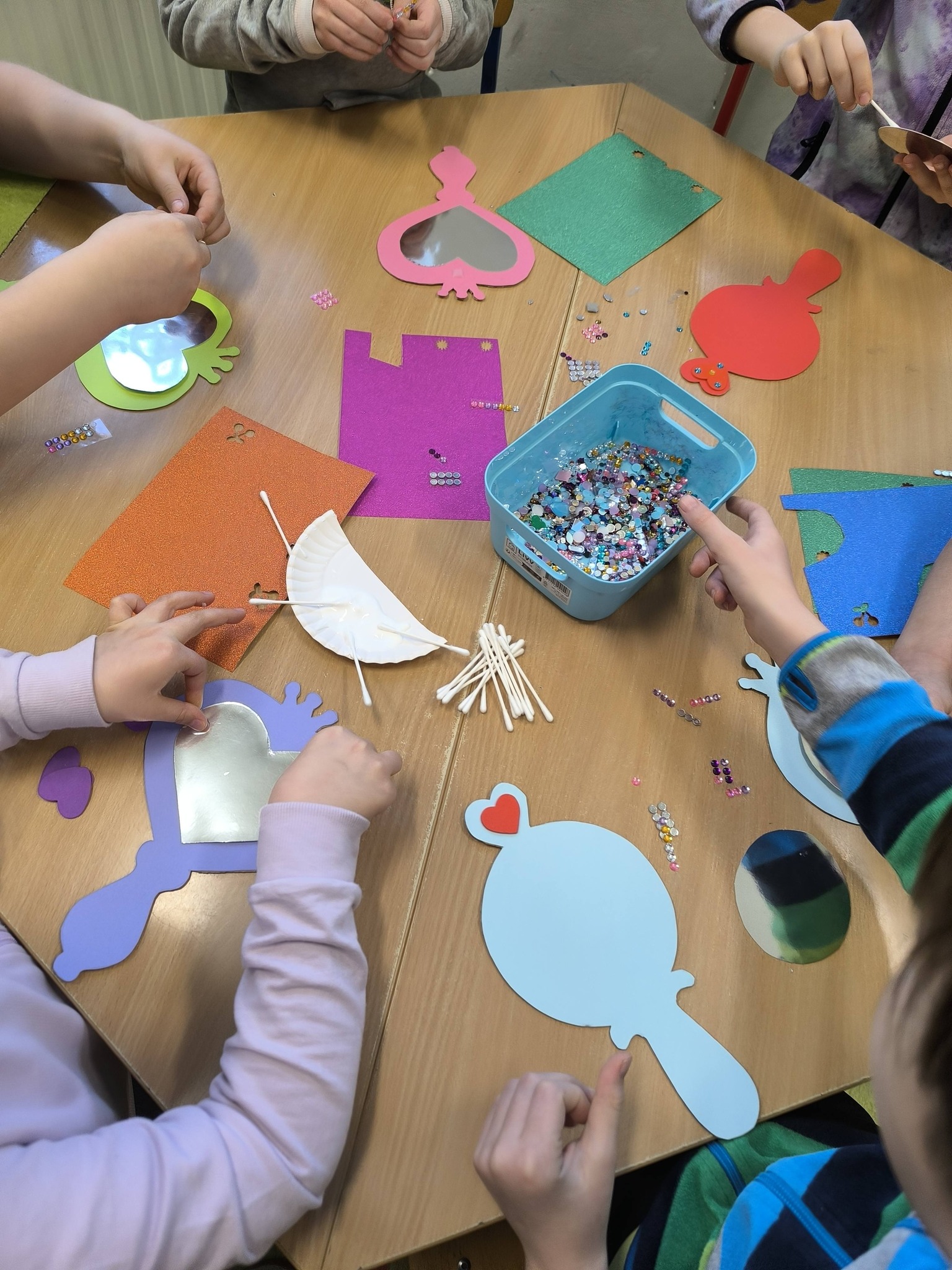 Opowiadały również, kim są kobiety w naszym życiu, a także rozwiązywały różne łamigłówki. Oczywiście nie mogło zabraknąć specjalnego prezentu. Świetlica zamieniła się w prawdziwą krainę lusterek, które dzieci tworzyły w kreatywny sposób.