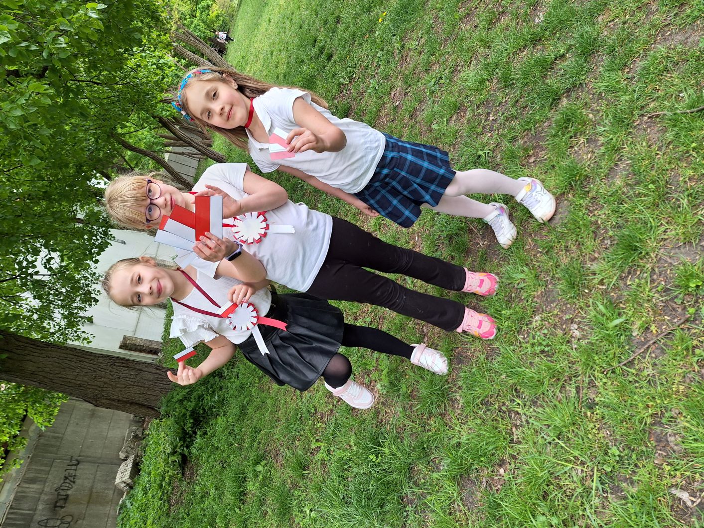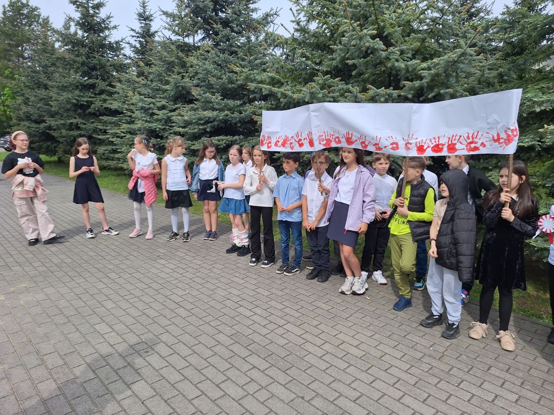 Uczniowie wraz z wychowawcami klas, w ramach obchodów Świąt Majowych, podjęli różnorodne działania. Uczniowie wspólnymi siłami wykonali dwie duże flagi, z którymi wyruszyli na przemarsz wokół szkoły. Odbyła się gra terenowa, podczas której uczniowie mieli za zadanie ukryć sobie wzajemnie na terenie szkolnego ogrodu 190 flag, a następnie je odszukać. Dzieci, ubrane w odświętne stroje, zaśpiewały piosenkę pt. " Witaj Maj, Trzeci Maj", zachwycając jej wykonaniem. Podsumowaniem obchodów był quiz wiedzy o Świętach Majowych i wiadomości na temat naszego kraju.